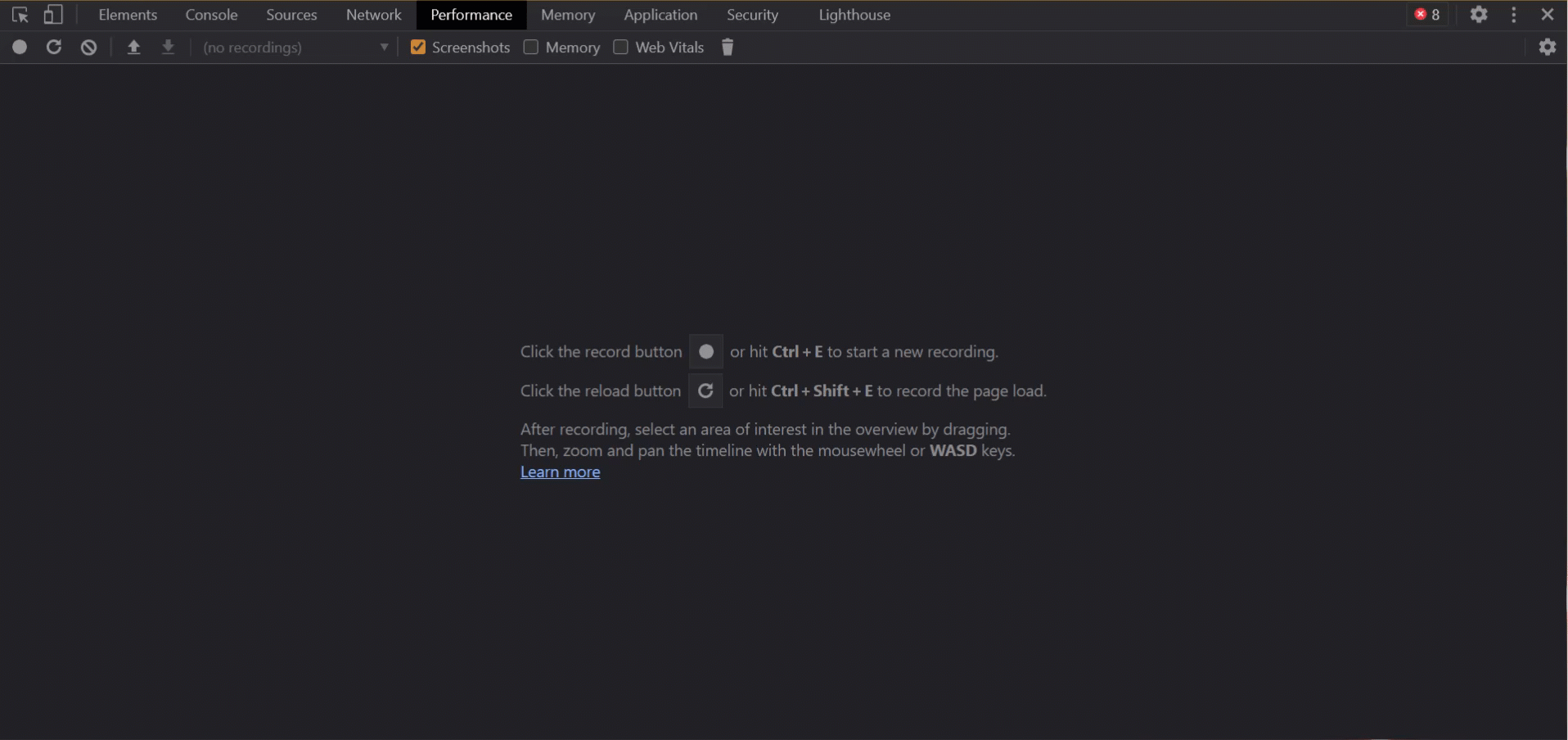 In the Performance panel press Cmd + E / Ctrl + E and then Ctrl + R / Cmd + R to refresh the page. Record the amount of time that you want to be monitored. You can then click Stop and evaluate the results.