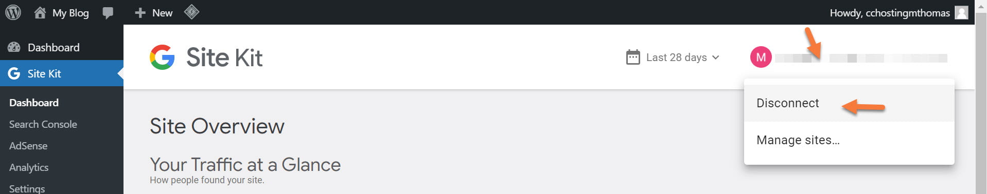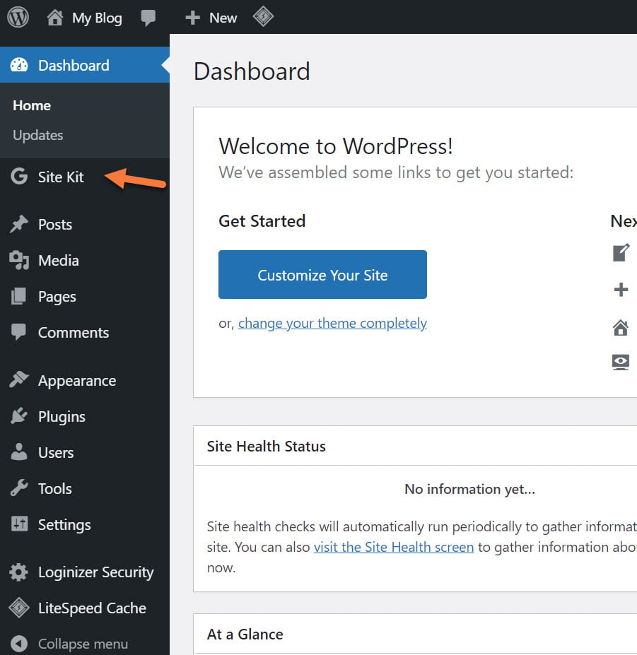 Step 1: To disconnect Site Kit, open your /wp-admin and click Site Kit from the left toolbar: