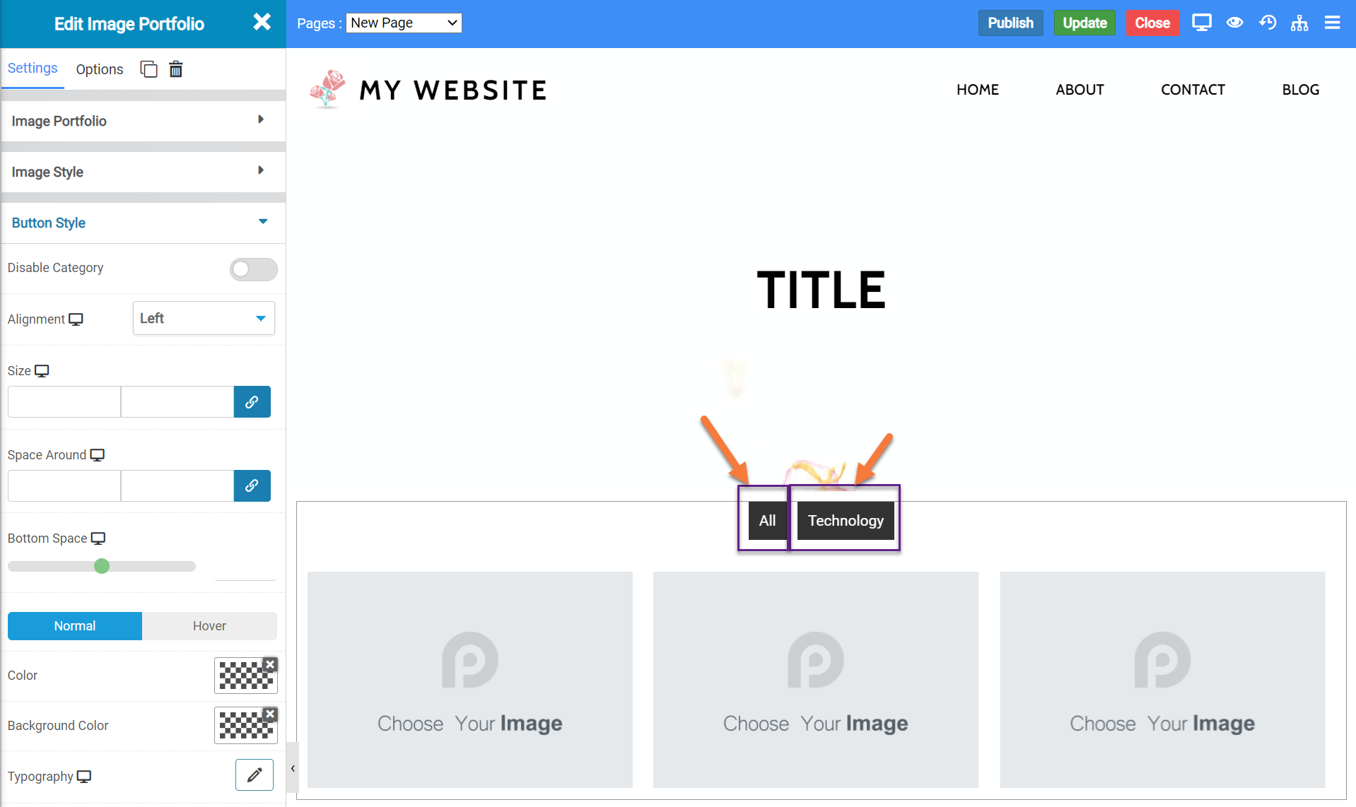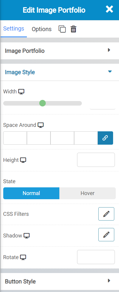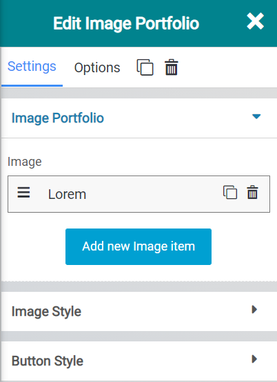 - Beneath Image portfolio, you have the option to add new images. By clicking Add New Image Item, you can add new items to the portfolio grid.