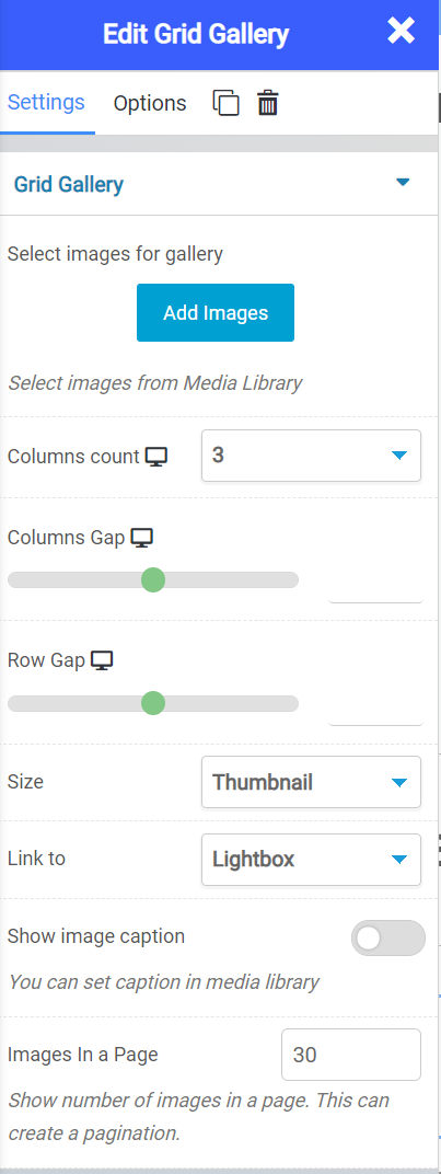 The Grid Gallery Widget has a few settings you should be aware of, including: