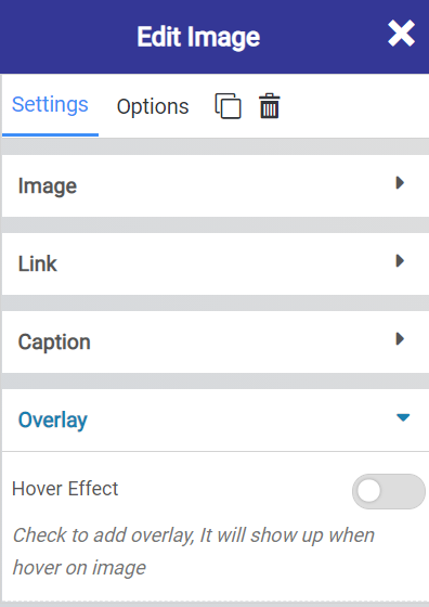 The Overlay setting allows you to set a Hover Effect overlay that shows when the user hovers over the image.
