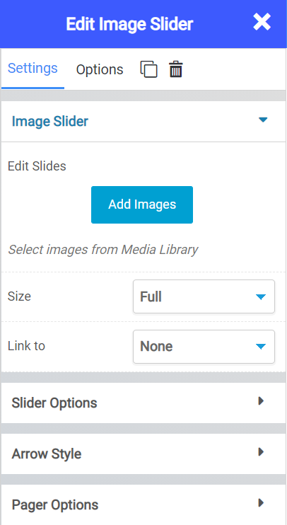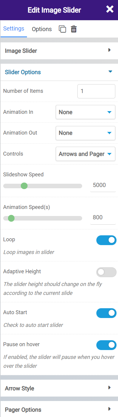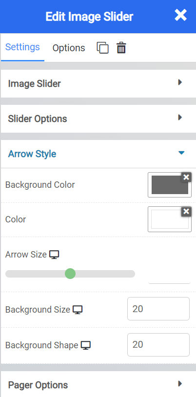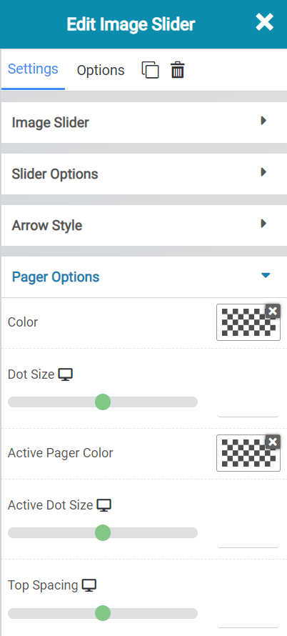 The Pager options allow you to control the little pagination feature that will display if you’ve added enough images to the image slider widget for there to be multiple pages. With these options, you can control or set the following: