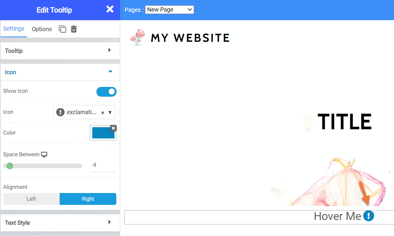 The Icon option allows you to insert an icon next to the tool tip widget text. You can choose from hundreds of icons.