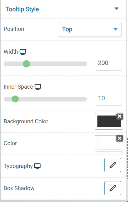 The Tooltip Style settings allow you to change settings related to the text that is inside the tooltip. I.e. the text which appears when the user hovers over the widget.