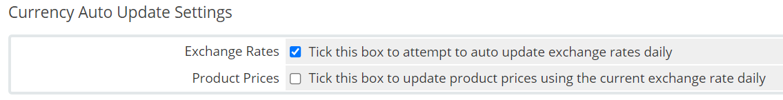 In Currency Auto Update Settings, you can choose whether WHMCS should update exchange rates daily, or whether product pricing should update automatically using the current exchange rate daily.