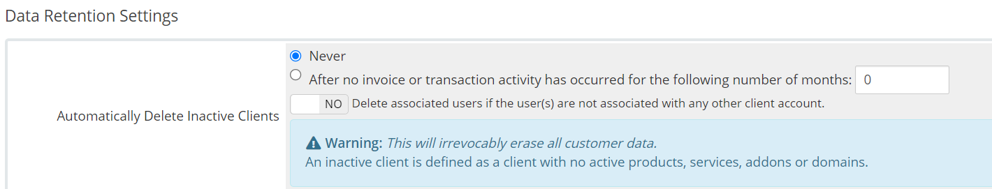 Data retention settings control how long clients with no active products, services, addons, or domains will be kept in the system before being automatically removed.