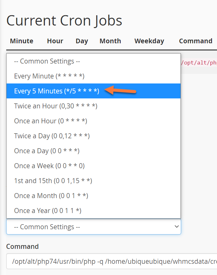 For daily automation in WHMCS to occur, a Cron job must be configured. The Cron is typically configured automatically during WHMCS setup. The default is to run this Cron every 5 minutes.