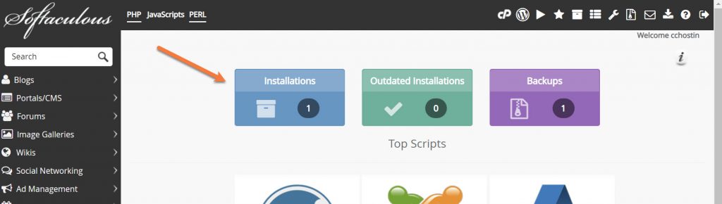 Step 3: From the Softaculous Home Page, click Installations to show all app installations.