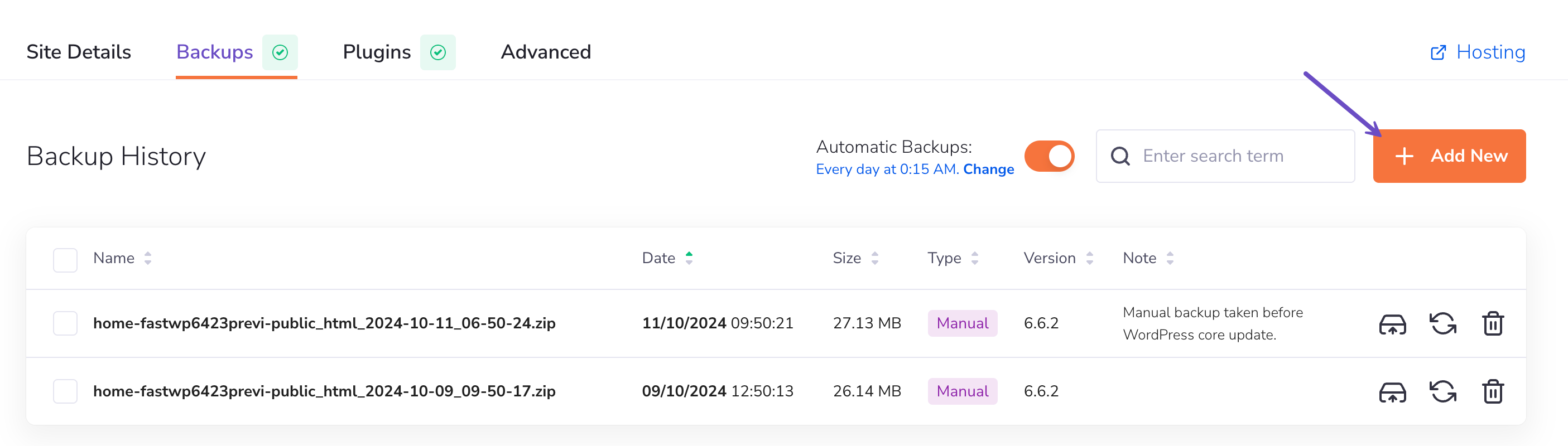 Automated Backup (Remote Backup): Automated backups happen in the background and are stored on a secure, remote server. These backups can be restored at any time, without using your hosting storage.