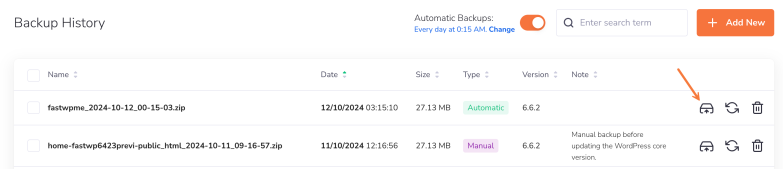This option allows you to download a backup of your WordPress instance, whether it was generated manually or automatically.