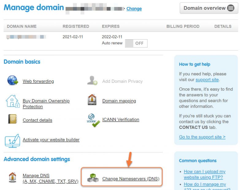Step 4) Beneath Advanced domain settings, click Change Nameservers (DNS).