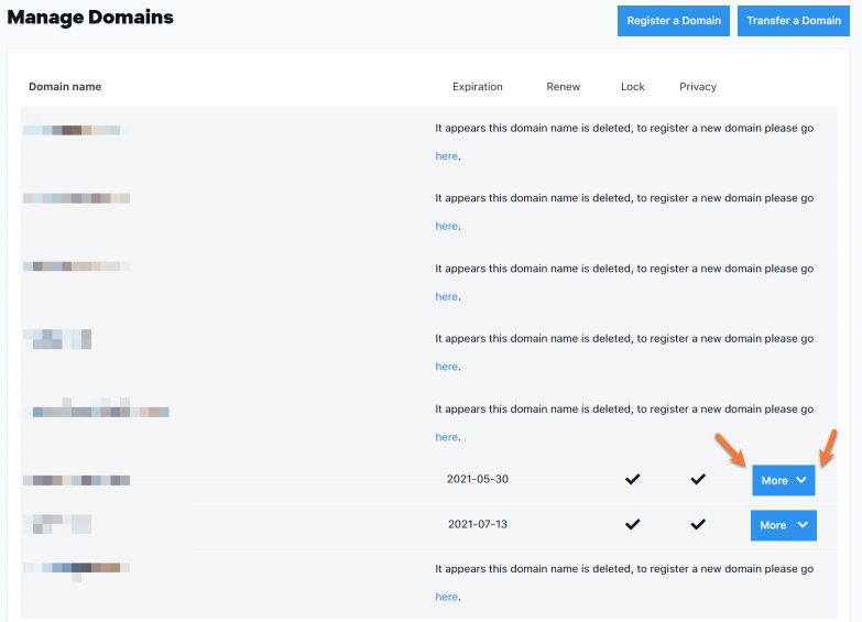 Step 3: When the Manage Domains area is open, locate the domain for which you want to change the nameservers and click the blue More button on the right.