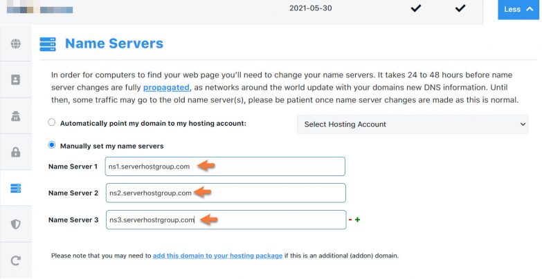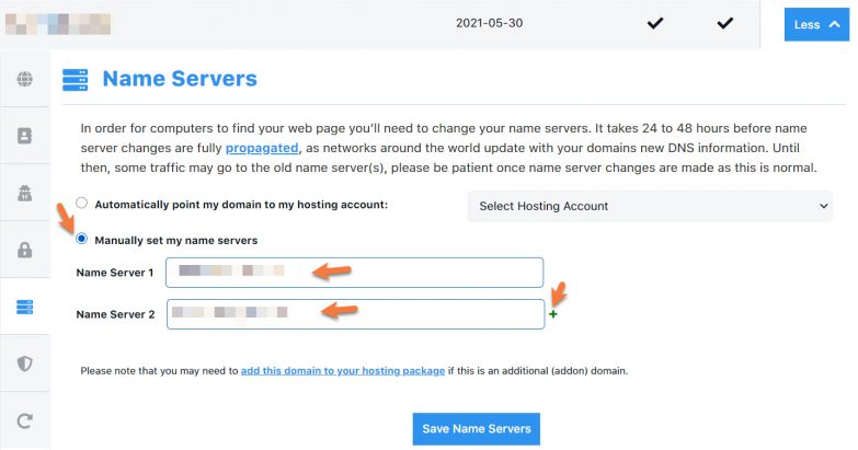 Be sure you have checked the box for “Manually set my name servers“. Then enter your first two nameservers.
