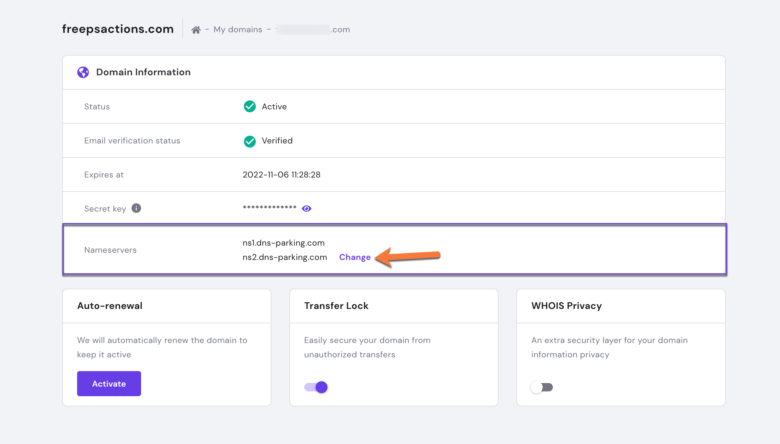Step 3: While you are on the Domain Overview page, see the Nameservers option and click on the Change button.