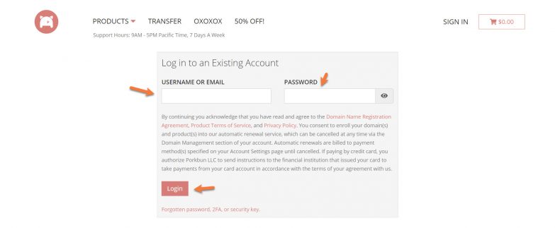 Step 1: Click here to open the Login page for your Porkbun Dashboard. Then enter your username and password and click the pinkish Sign In button.