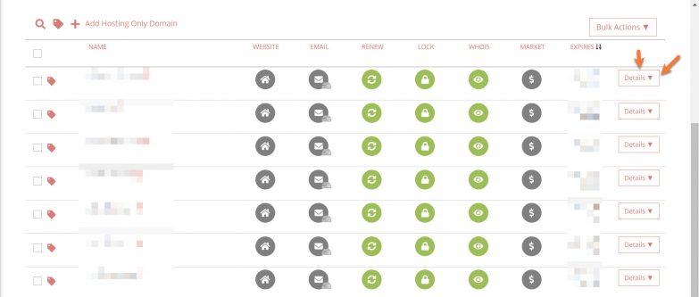 Step 2: Your domains list will load. Click the Details button in the far right column to open the Domain Details view.