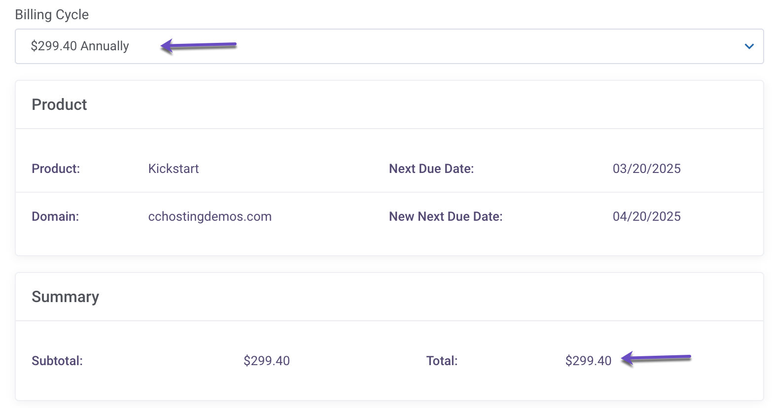 - New Next Due Date → The updated expiration date after the billing cycle switch.