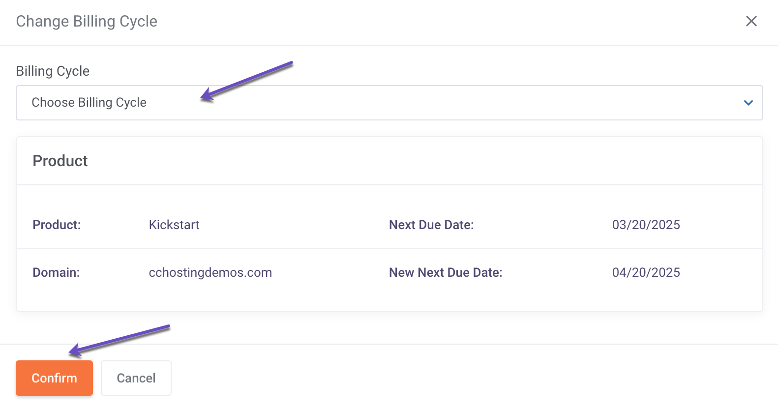 - Click the “Confirm” button to finalize your billing cycle change.