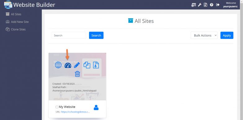 Step 3: When the Website Builder opens, hover over the site for which you wish to change the theme and click the speedometer icon to Login to the site.