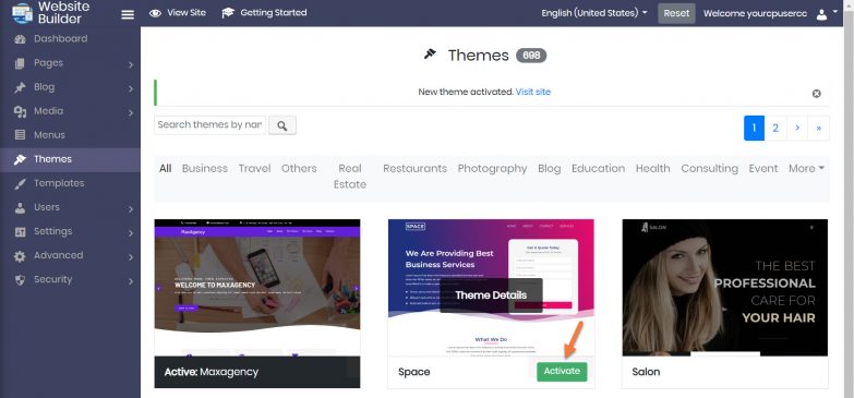 After clicking Activate, you will see a note at the top of the page stating the new theme has been activated.
