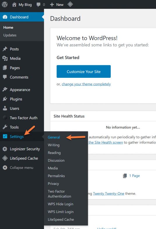 Step 1: Login to your /wp-admin and using the menu on the left hover over Settings and click General.