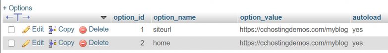 The rows we need to look for are at the top. Look under the column option_name for the ‘siteurl’ and ‘home’: