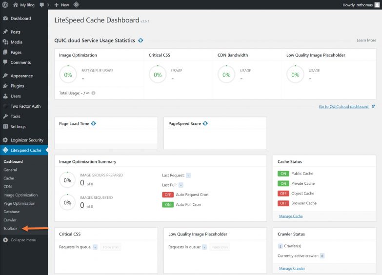 Step 2: You will be taken to the LiteSpeed Cache Dashboard, and you’ll also note a number of options have appeared in the left menu as the LiteSpeed Cache app has expanded.