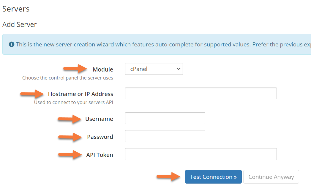 Since we are adding a cPanel server, be sure cPanel is the option selected next to Module.