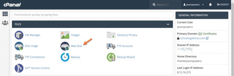 Step 1: Log in to your cPanel. Once logged in, look under the Files section for Web Disk.