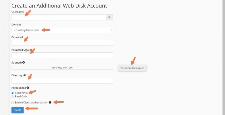 Step 2: On the Create an Additional Web Disk Account, you have several options. Let’s review them.