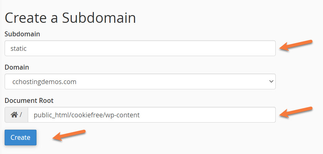 Step 3: To have your static content, such as CSS Stylesheets, Images, and Videos served on a subdomain, you’ll need to create the subdomain first. In this case, we’re going to call our subdomain ‘static’, without the quotes around it.