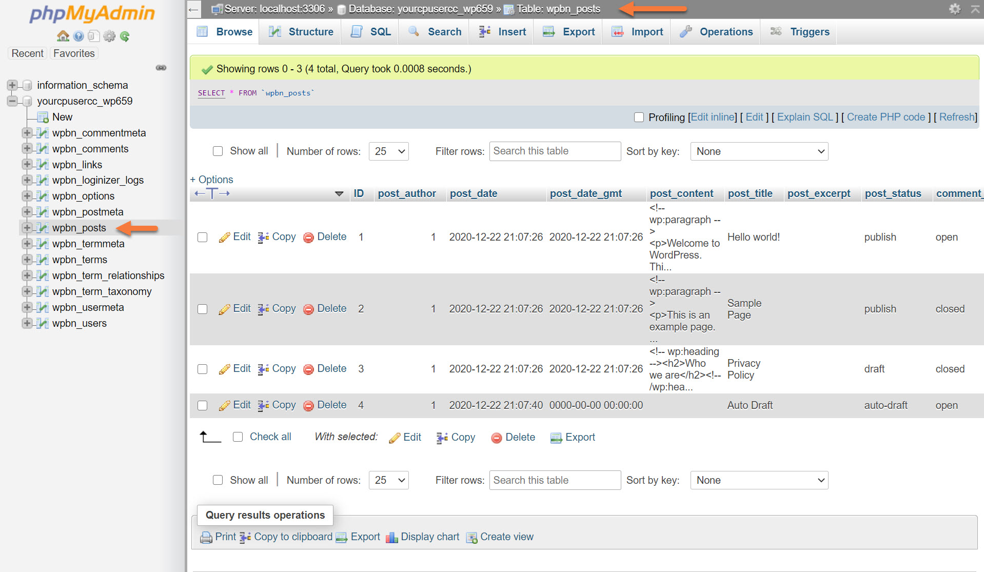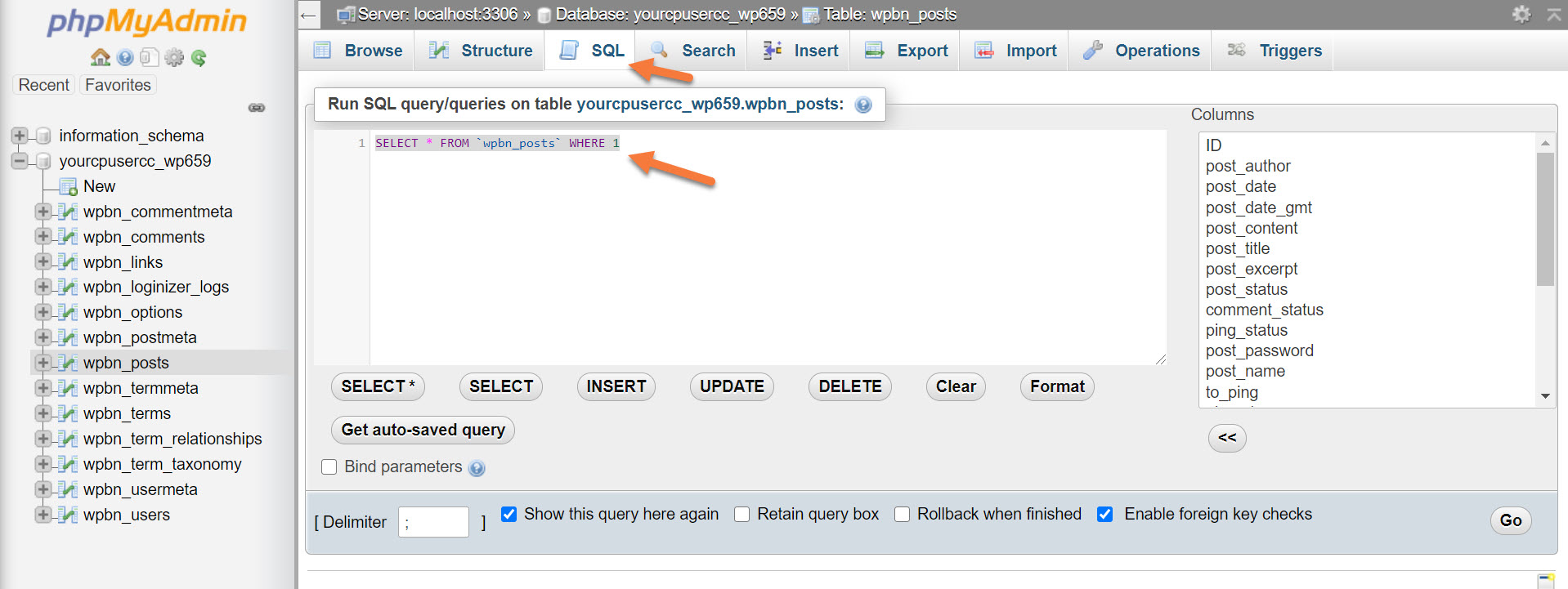Since you have content in your database, as you have existing posts and pages, we will be modifying the posts table, which is prefixed for my installation by wpbn_.