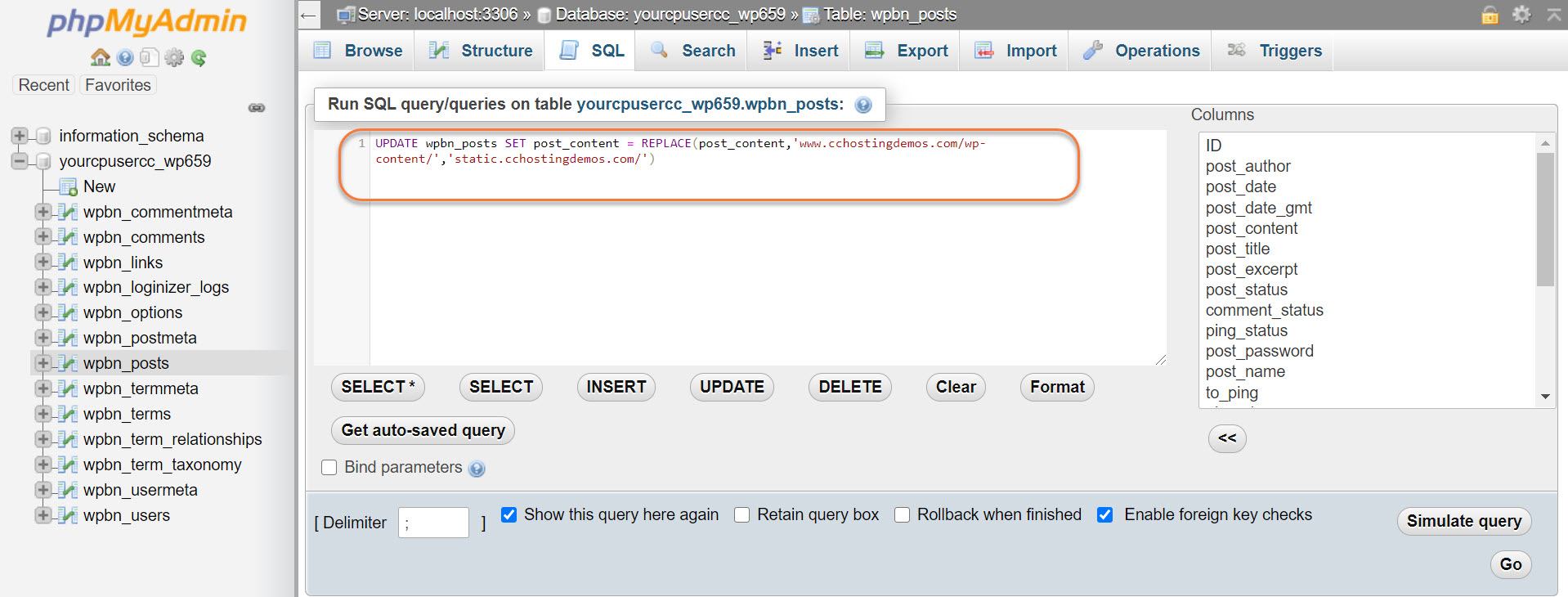SET post_content = REPLACE (post_content,’www.yourwebsite.com/wp-content’,’static.yourwebsite.com/’) tells phpMyAdmin we are making changes to the row post_content and the change we are making is changing the URL.