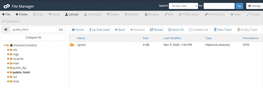 In our example, our public_html folder is empty, save for the cgi-bin folder.