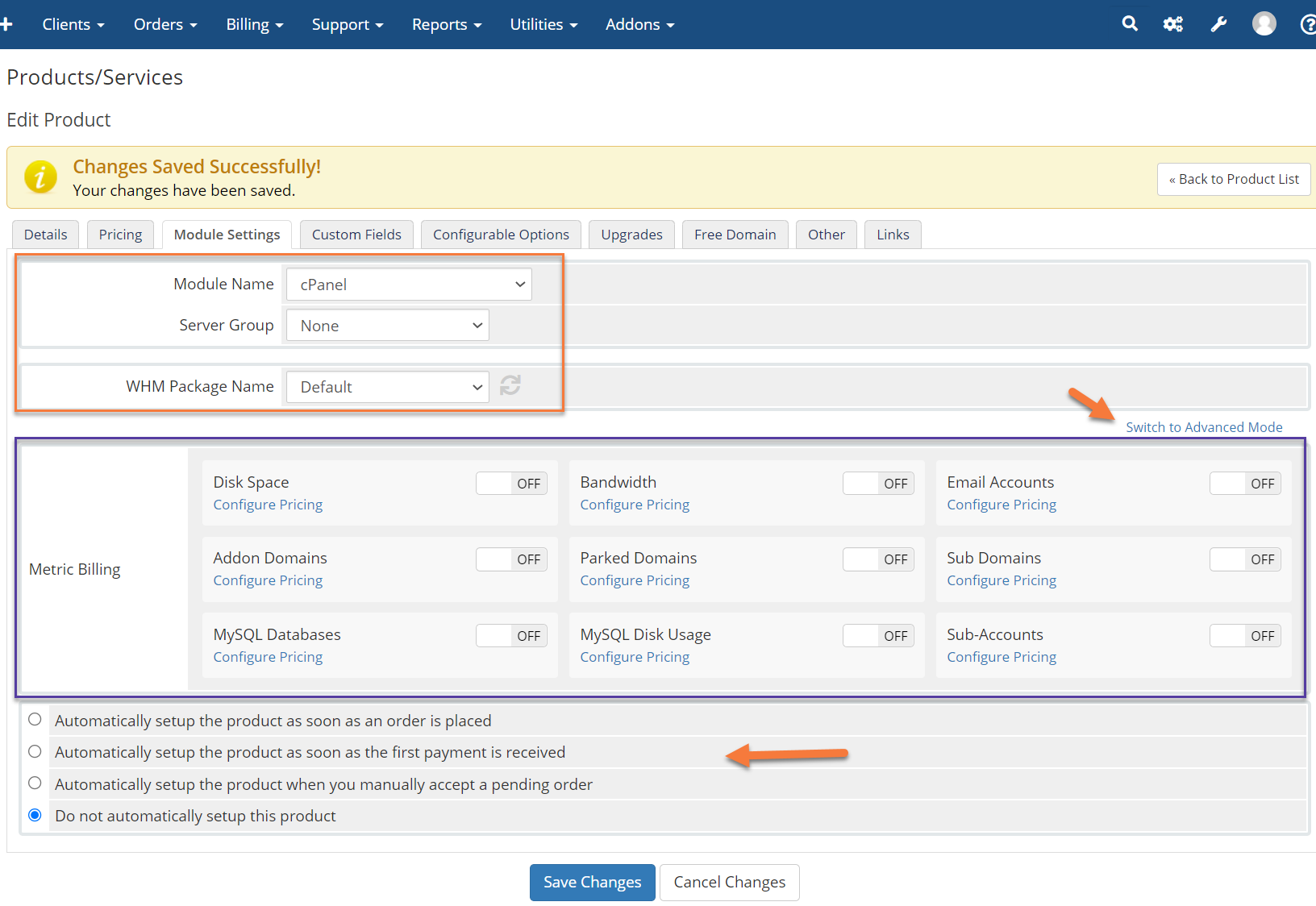 - If you wish to control the configuration (Disk Space, Domains, FTP, etc) that goes with this plan, click “Switch to Advanced Mode” and you will be able to control these settings.