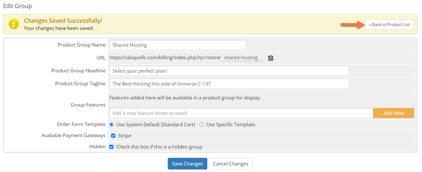 - First you need to enter a Product Group name. Remember, the product group is what will contain all the different products beneath it. For example, if you offer Shared Hosting to your customers and have 3 different plans, the plans will be individual products, while the group will be “Shared Hosting”.