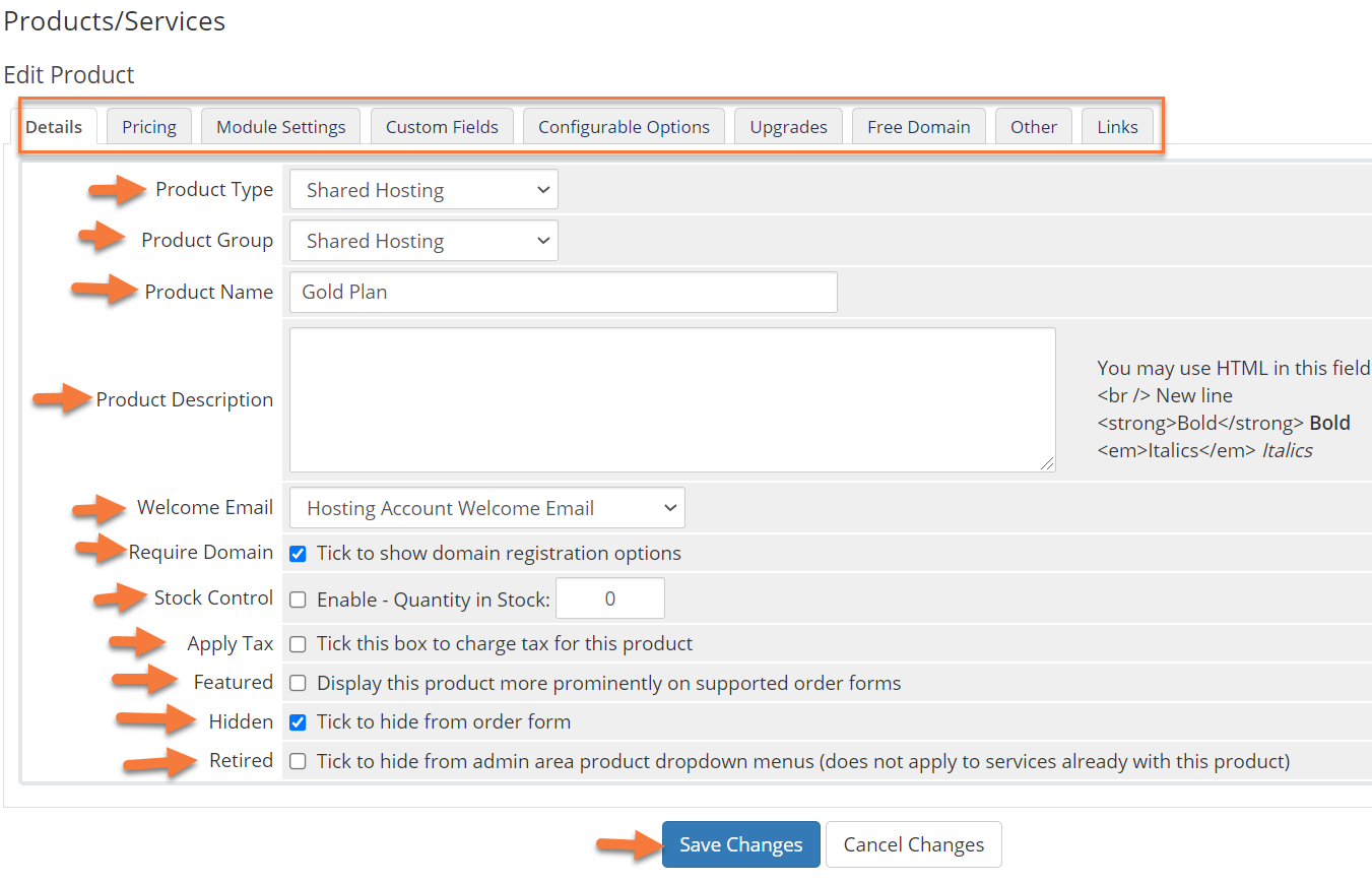- Keep in mind: You can use HTML in the Product Description Field. The contents of this field are what will display beneath the product listing in your Store when customers are viewing your product listings within the Shared Hosting category.