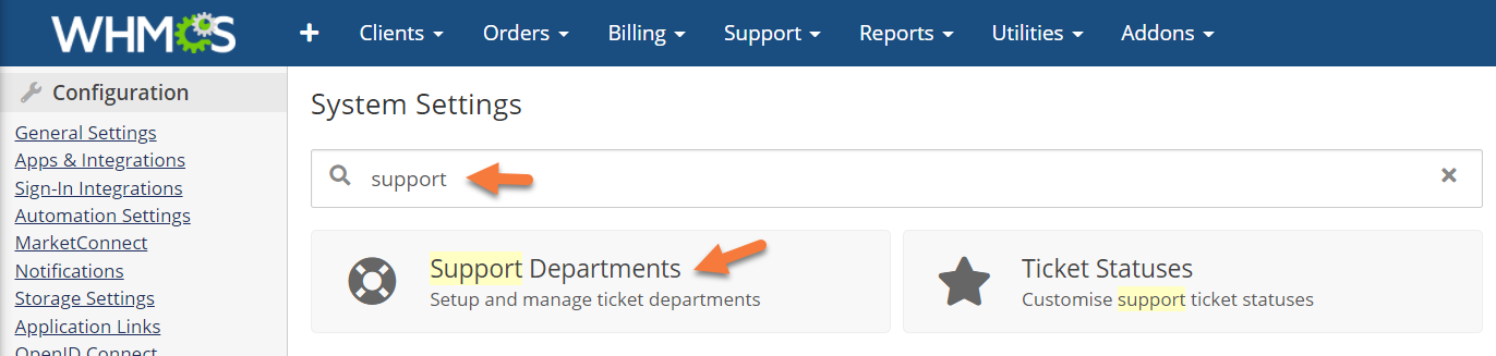 Step 2: Once the System Settings page loads, use the search function at the top to search for ‘support’, and the Support Departments option should load: