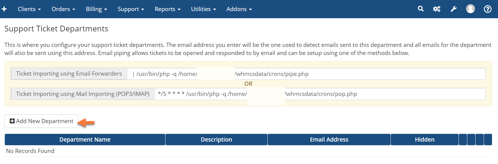 Step 3: Once the Support Ticket Departments area opens, you’ll see a list of your departments, as well as the Email Piping Paths to import tickets sent via email.