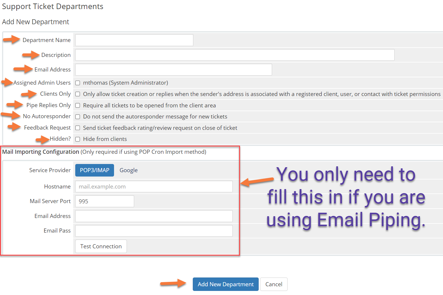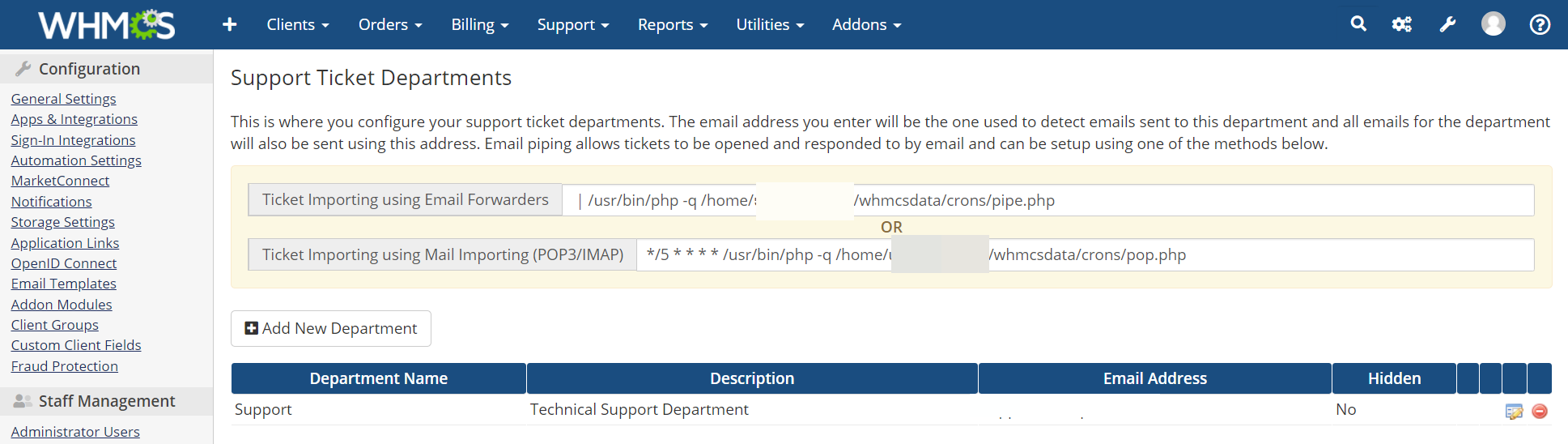 If you aren’t using POP3 Importing or Email Piping, you can click Add New Department to add this new Support Department into WHMCS, and you’re good to go!