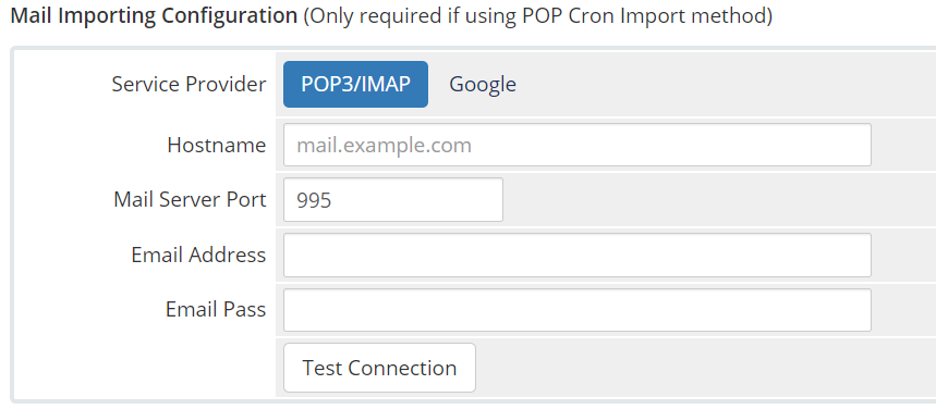 If you are using POP3 Importing, or Email Piping, you’ll need to fill in the Mail Importing Configuration fields Continue reading to the next section for assistance.