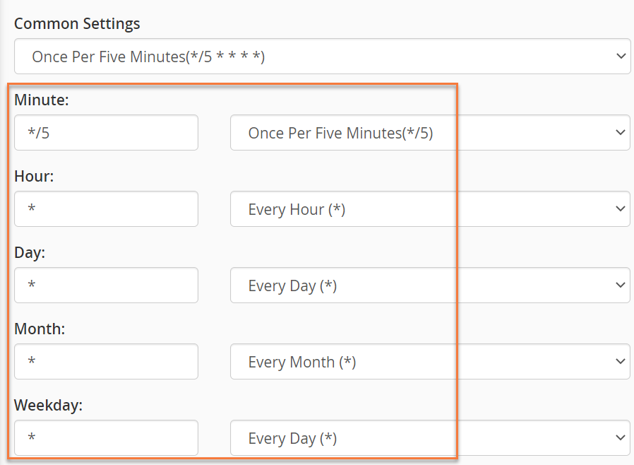 The forms will prefill with the command structure to have the cron run once per 5 minutes and those fields should look like the ones below: