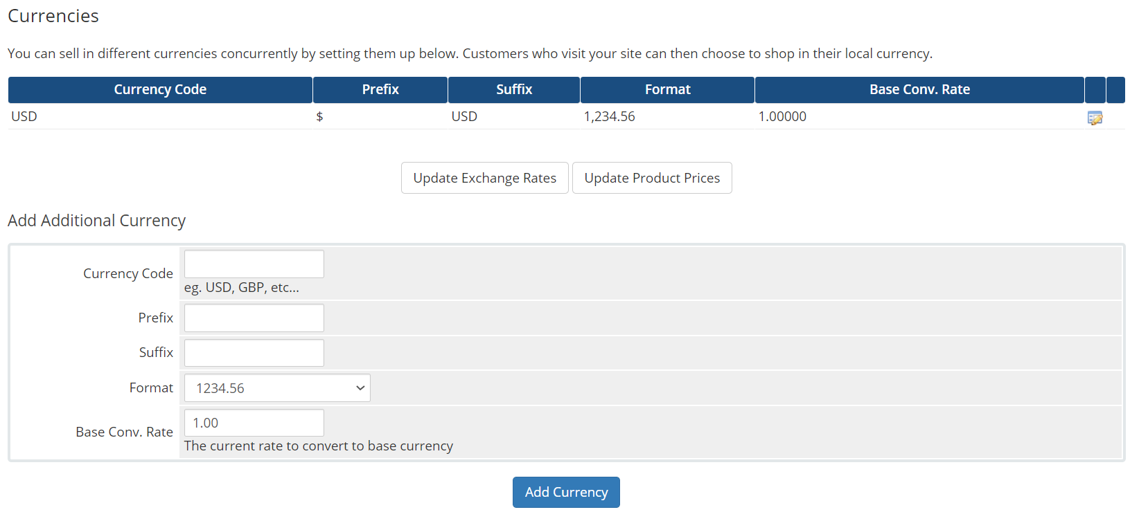 The fields for adding or editing a currency are the same regardless of the currency.