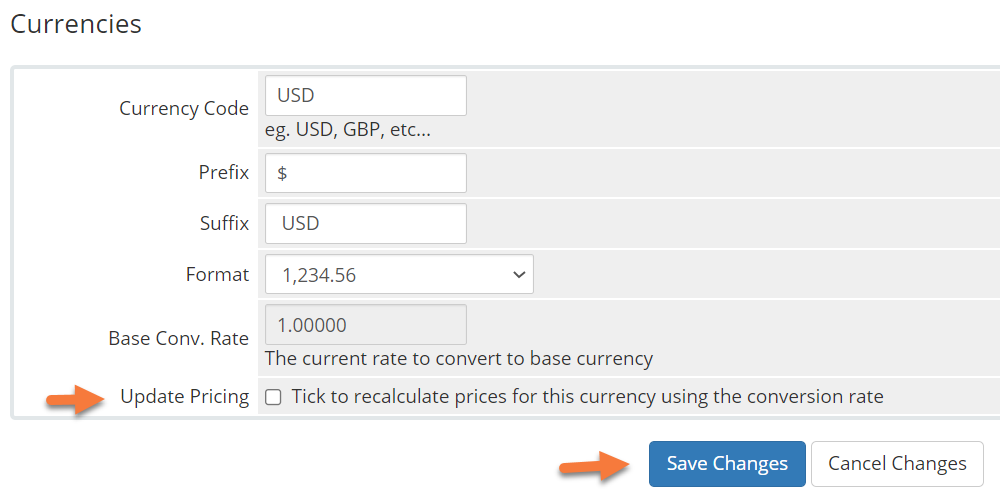 Step 5: if you want to automatically update any existing invoices with your new currency, you can tick the last box to do this. However, we don’t recommend doing this on existing installations because it only updates the currency and not the actual monetary amounts on the invoices.