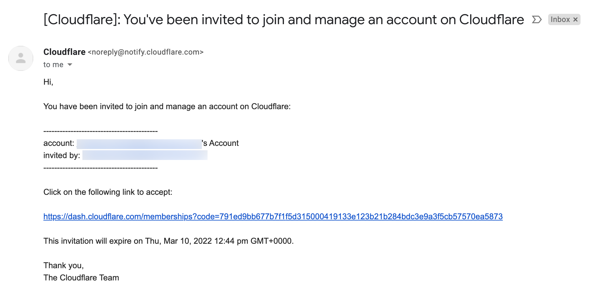 Once the user clicks the link in the email they receive, they’ll be able to access your Cloudflare account with the default permissions of an Administrator.