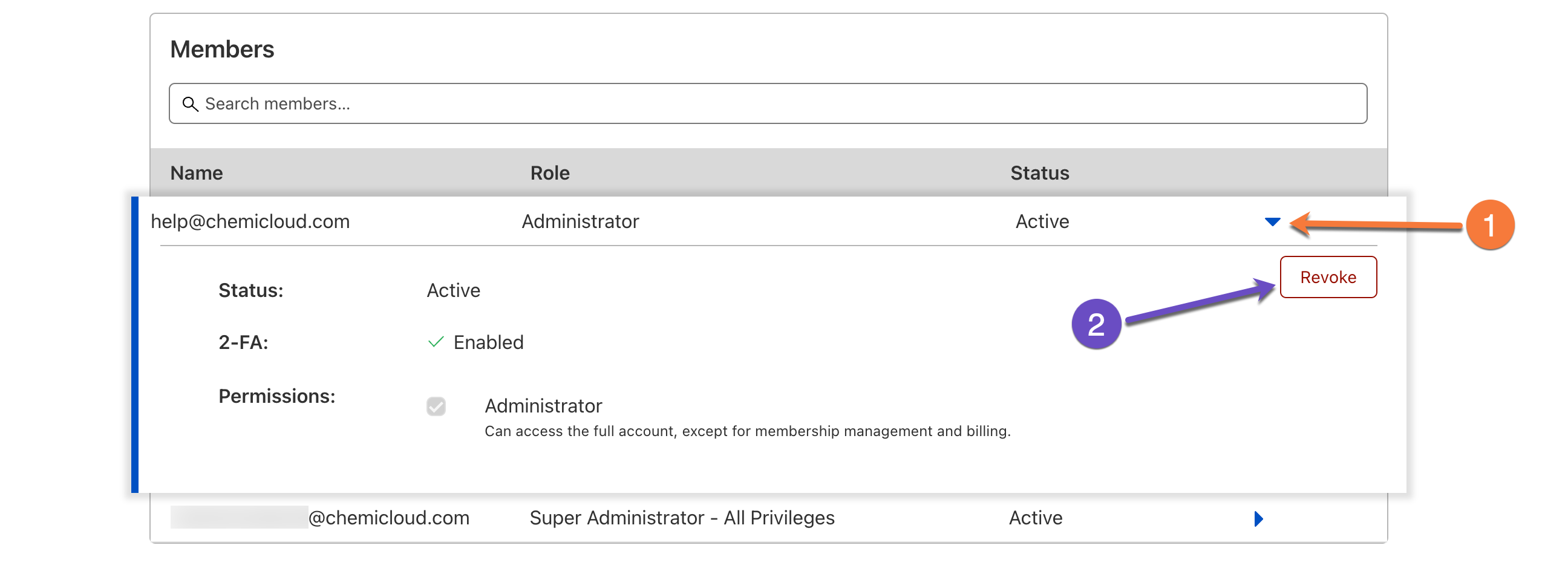 Step 3: At the bottom of the Members page, locate the member you’d like to remove and click the triangle angled to the right. When the modal expands, click the Revoke button to remove their access to your Cloudflare account.