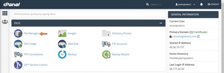 Step 2: Look in the Files section (1st section from the top) and click to open the File Manager.