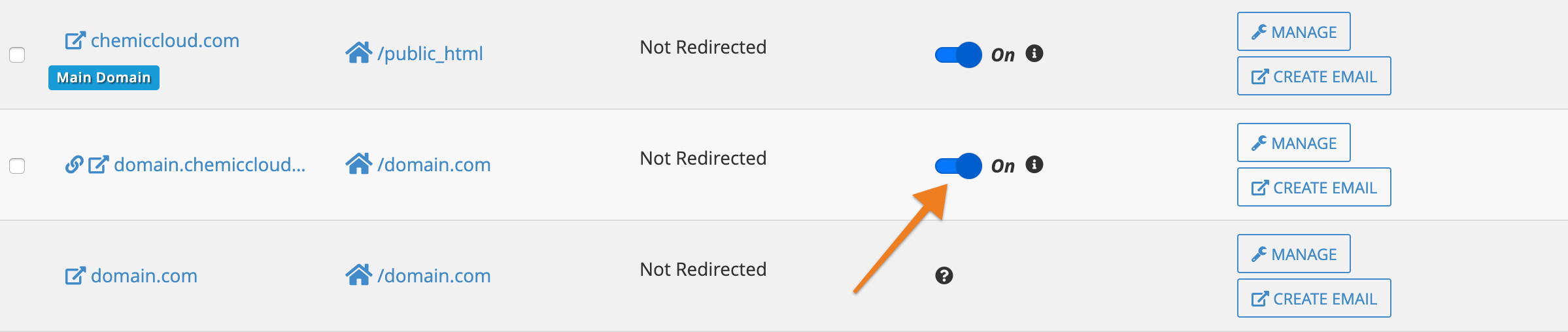 Then the domains interface will appear, where you will see a list of all the domains on your cPanel account. You’ll see the “Force HTTPS Redirect” column.