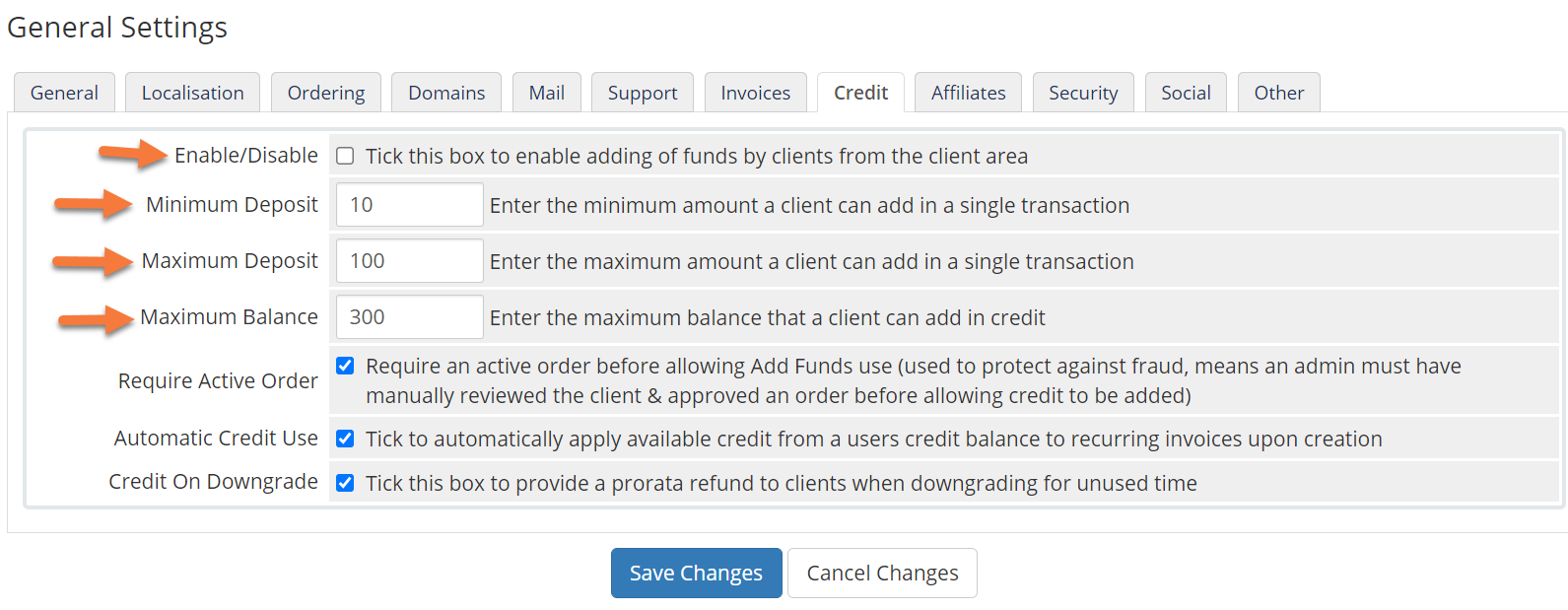 By default, this is disabled, however, if you wish for your customers to be able to pre-load the account with money, you can enable this, then configure the maximum and minimum deposit amounts, plus the overall maximum balance an account can have.