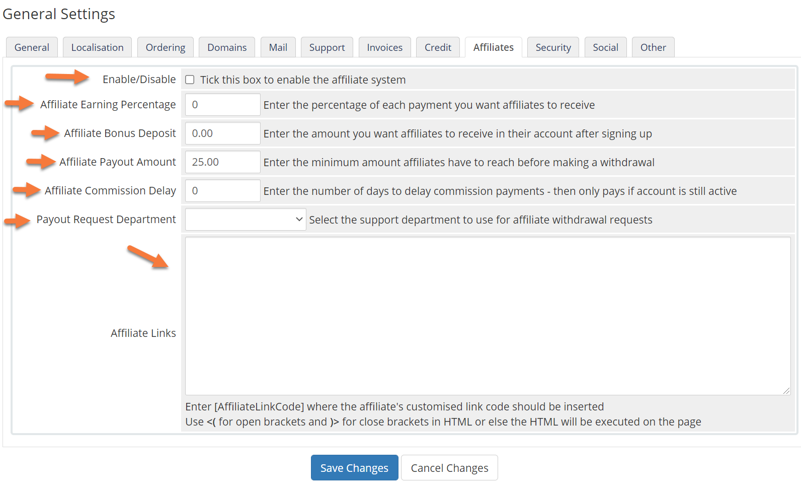 The Affiliates section controls settings related to the built-in Affiliates system in WHMCS.